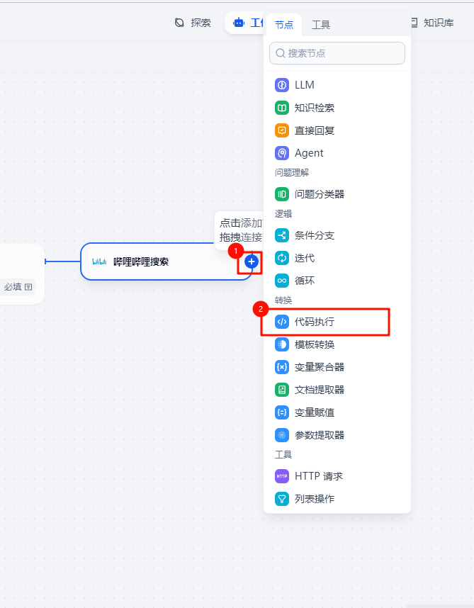 在开始节点后添加哔哩哔哩搜索节点:在点击添加节点后选择工具——>BiliBili搜索——>哔哩哔哩搜索