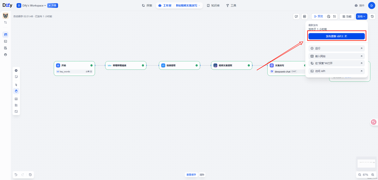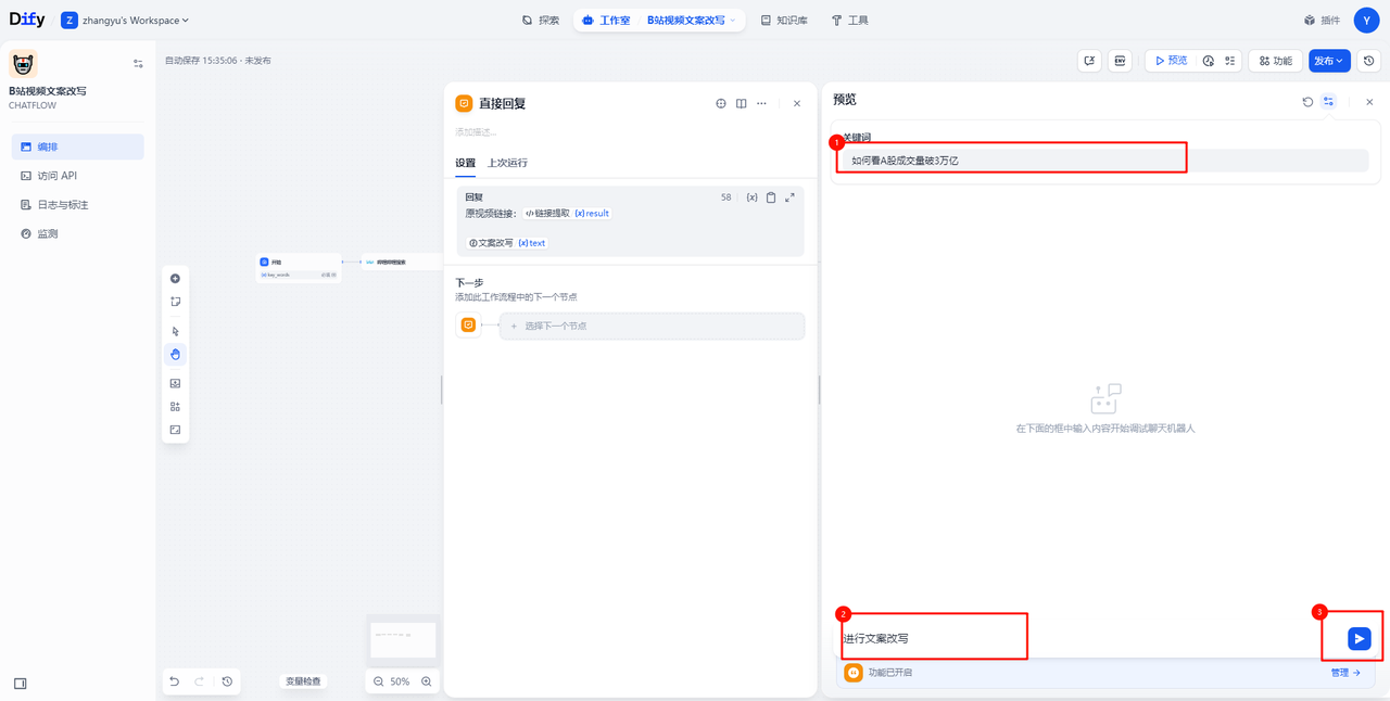 直接回复输出“链接提取”的“url” 和 "文案改写"的text变量即可,到这里我们的整个工作流就搭建完成了
