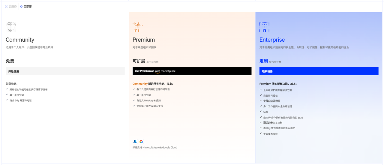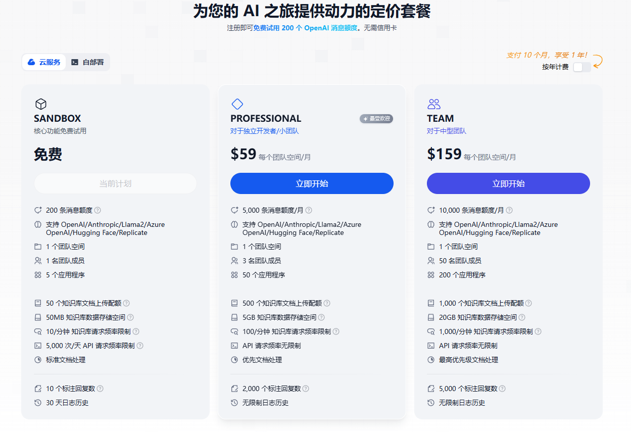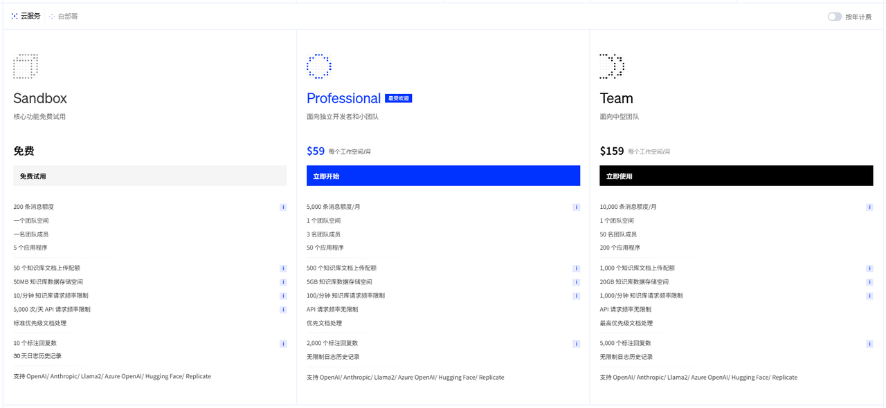 Dify提供不同版本的服务方案,从免费试用、专业版到团队版和企业版,适应不同规模的开发需求,选择云端官方访问Dify进行应用开发的朋友可以按需选择,轻松开启Agent开发之旅