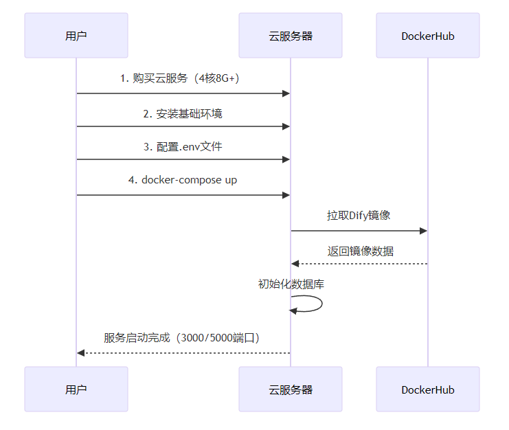 选择适合的云服务器提供商 -> 完成基础环境配置 -> 配置Dify的核心参数 -> 通过Docker Compose启动服务 -> 通过Docker Compose启动服务