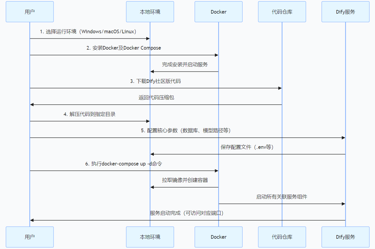 选择适合的本地运行环境(如 Windows、macOS 或 Linux)→ 安装并配置 Docker 及 Docker Compose→ 下载并解压 Dify 社区版代码→ 配置 Dify 的核心参数(数据库、模型路径等)→ 使用 Docker Compose 启动服务