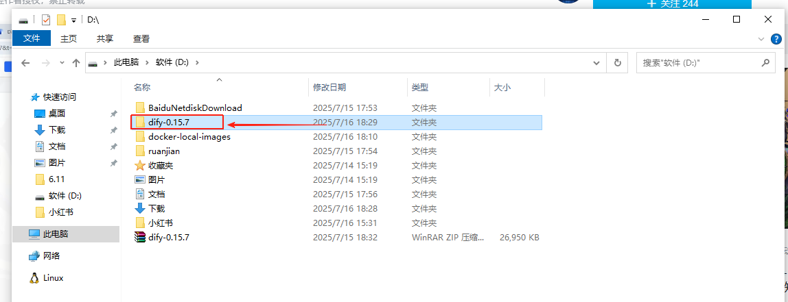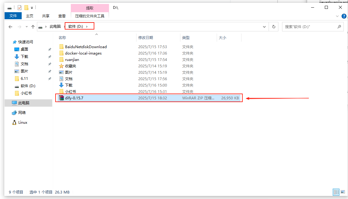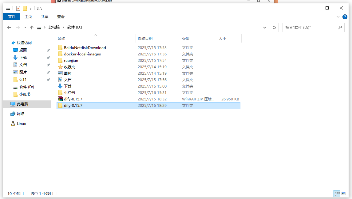 验证完毕之后,我们再继续部署步骤,回到D盘目录下,将之前下载好的ZIP文件解压到当前目录下