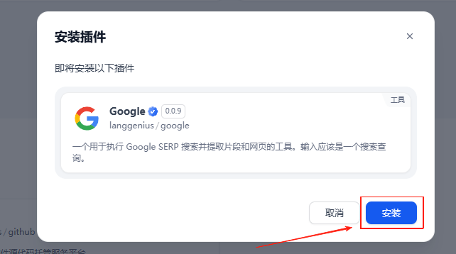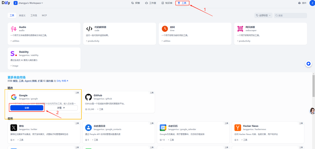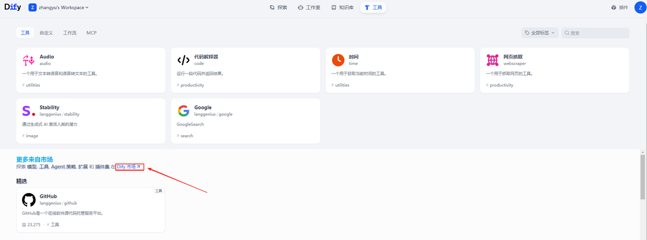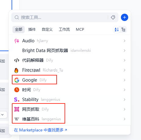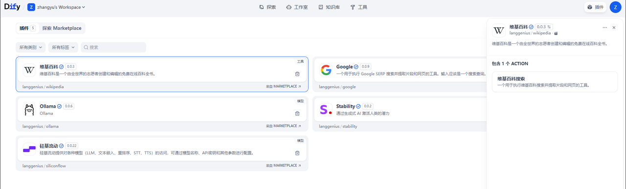 接下来就再次进行这个插件的配置,并且展示一下如何在Dify市场选择插件进行配置,其实步骤都是一样的,但是担心有的朋友看不懂,所以还是单独写出来