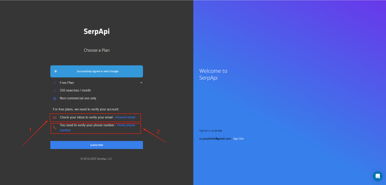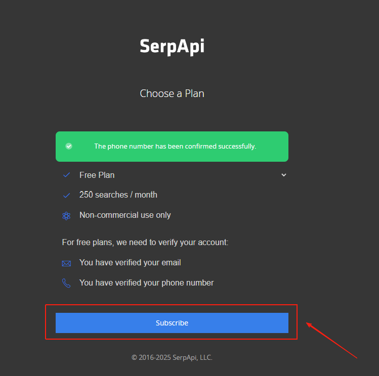 SerpAPI提供每月 250 次搜索的免费调用次数,这足够我们完成本次实验了如果你需要更多的额度,可以增加余额,或者使用其他的开源方案。