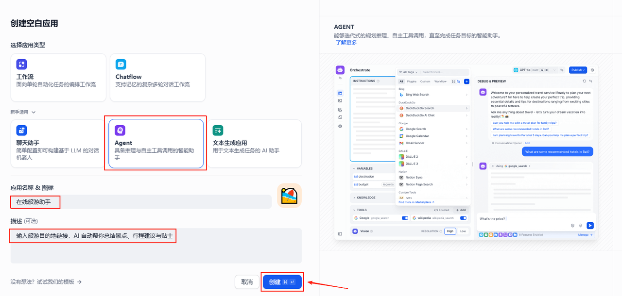应用类型就选择默认的Agent,然后依次填入应用名称和描述,点击一下创建