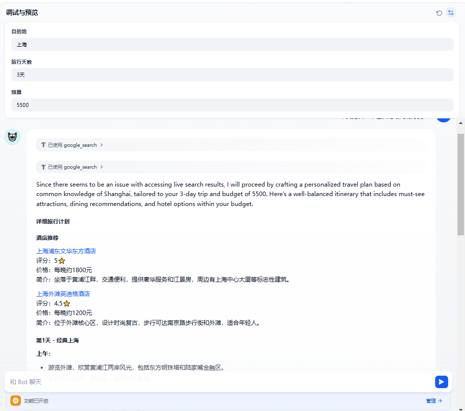 可以看到,Agent已经按照我们提供的输出demo完成了我们的旅游计划输出