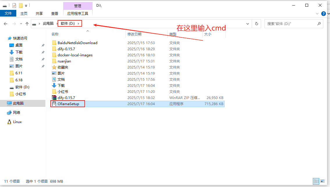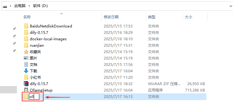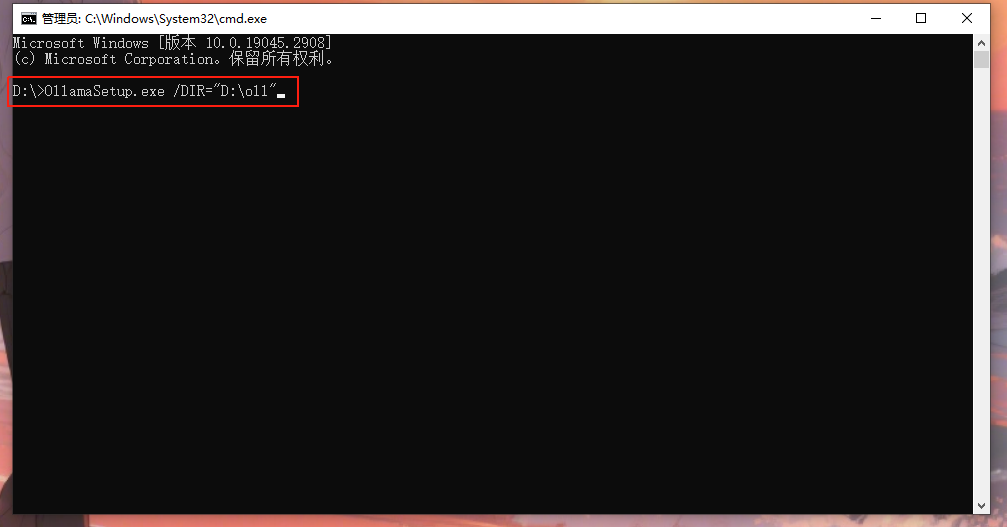 我们是D盘下的一级目录,所以安装的目录位置为:"D:\oll"点击复制命令OllamaSetup.exe /DIR="你要安装的目录位置"