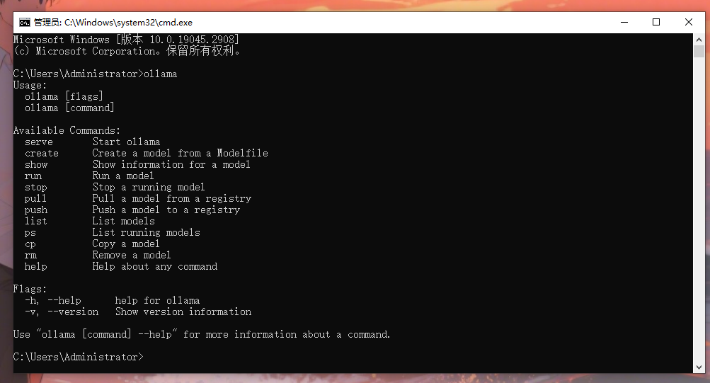 接下来在命令行窗口检验一下,输入ollama出现这些内容,就说明配置成功了