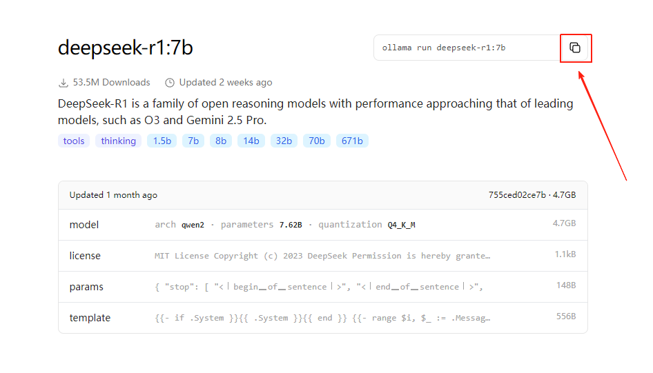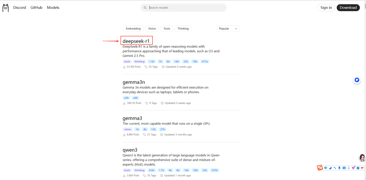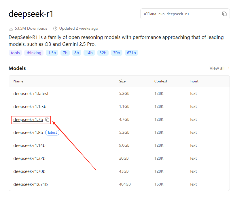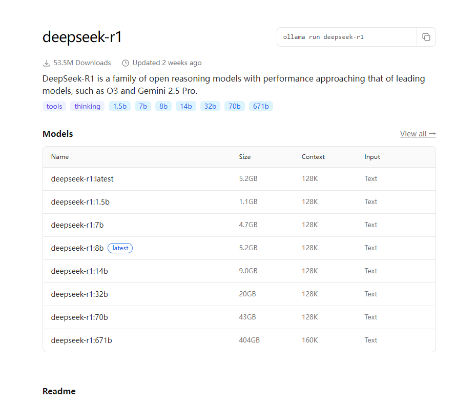 进入页面之后可以看到deepseek也是有很多版本的,大家按照自己的需求进行下载即可