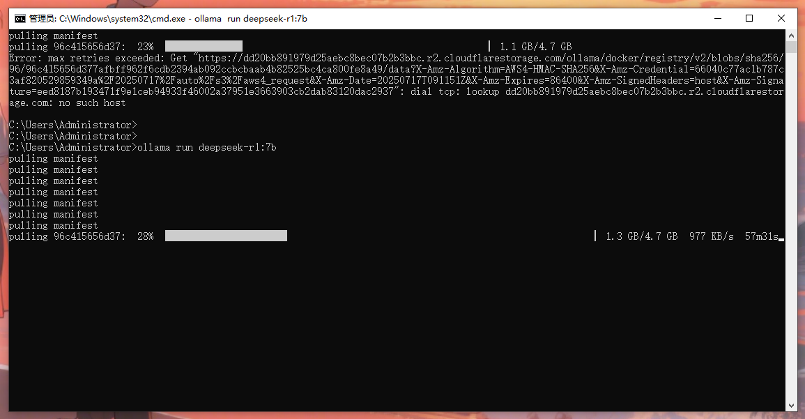 出现报错重新拉取几次就行了,要么是电脑配置过低模型不匹配,要么就是网络不稳定太卡了